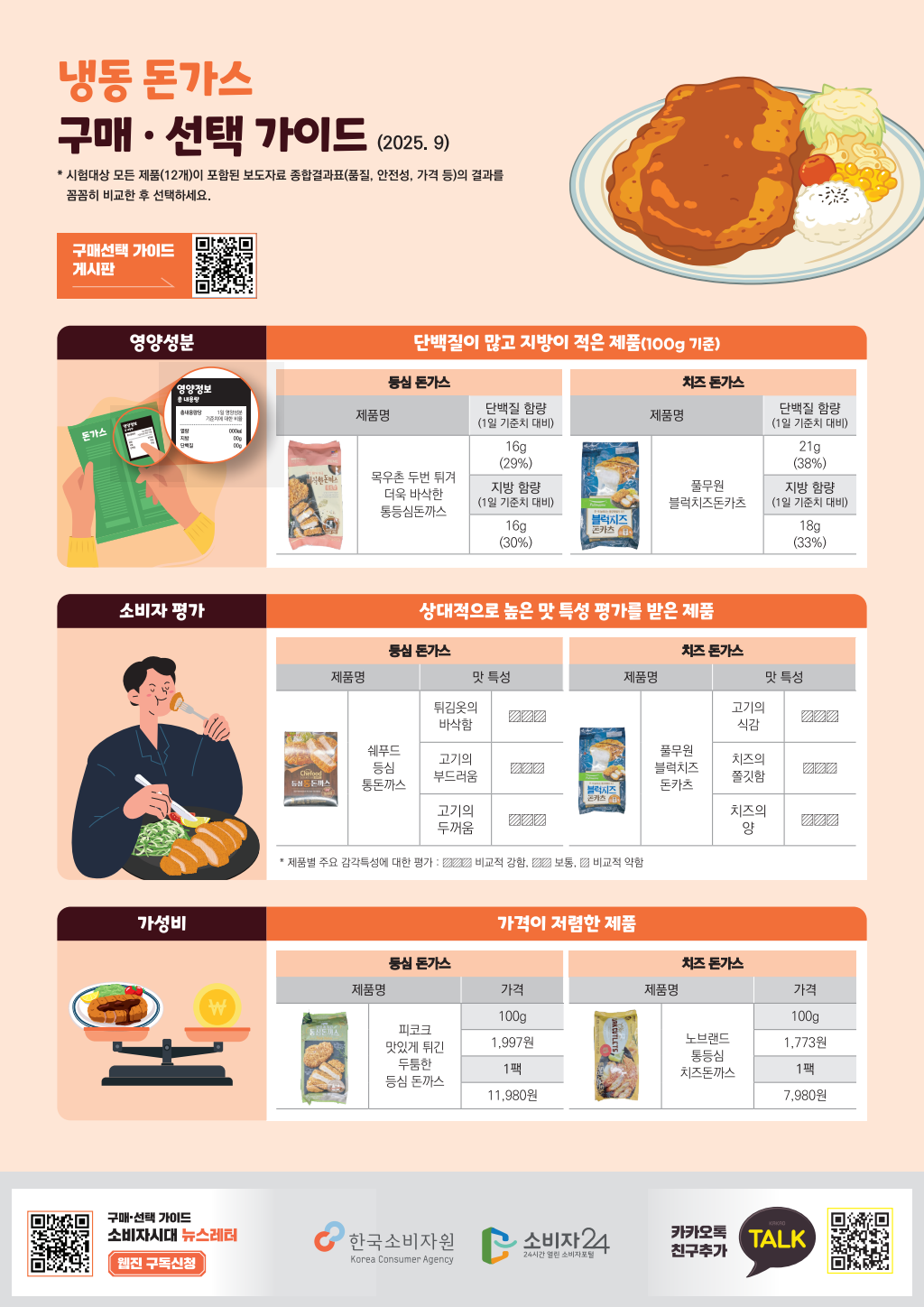 하지만 막상 어떤 제품을 골라야 할지 고민되셨죠? 그래서 한국소비자원에서 시중에 판매되는 냉동 돈가스 12개 제품의 품질(영양성분, 맛 특성 등)과 안전성을 꼼꼼하게 비교 시험한 결과를 발표했습니다. 우리가 궁금했던 점들을 시원하게 긁어주는 결과, 지금부터 알기 쉽게 소개해 드릴게요!